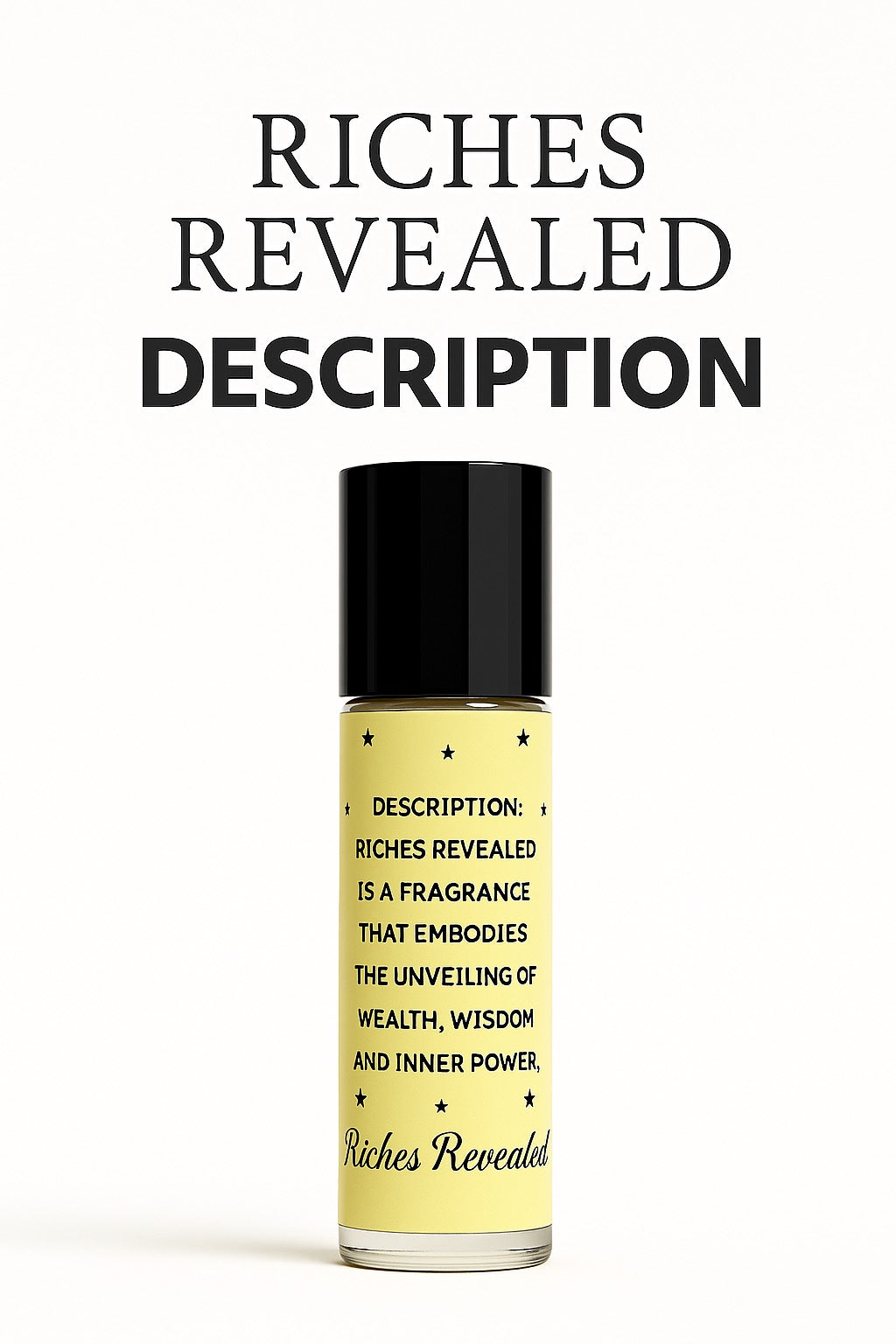 Riches Revealed — The Scent of Quiet DominanceIndulge in the golden allure of Riches Revealed, a fragrance that speaks before you do. Crafted for those who move with calm certainty, this scent unveils a world of understated luxury — where sweetness meets depth, and confidence needs no announcement. Opening with smooth sweet and spicy top notes, the aroma draws you in like the warmth of success itself. As it settles, woody undertones intertwine with caramel and patchouli, creating a rich harmony that evokes both power and grace. Finally, a veil of warm musk lingers — a whisper of legacy left behind long after you’ve gone. This isn’t a fragrance that shouts. It radiates presence — refined, golden, unforgettable.